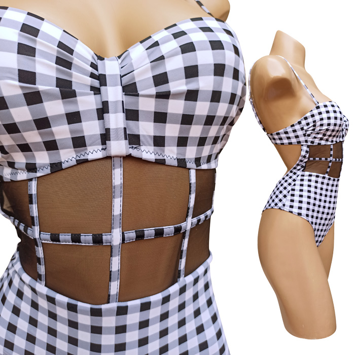 Maillot de bain femme 1 pièce, doublé devant et derrière. Soutien gorge coques avec armatures. Maillot "imprimé type carreaux vichy "sur l'ensemble. Transparence sur le ventre (filet). Bretelles épaules réglables et amovibles avec attache dans le dos pour une meilleure tenue. 2 couleurs et 5 tailles indiquées sur étiquette : 40-42-44-46-48 (Italienne).