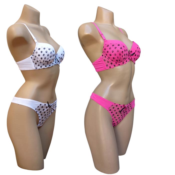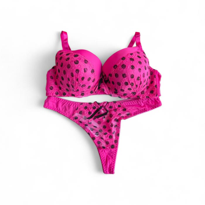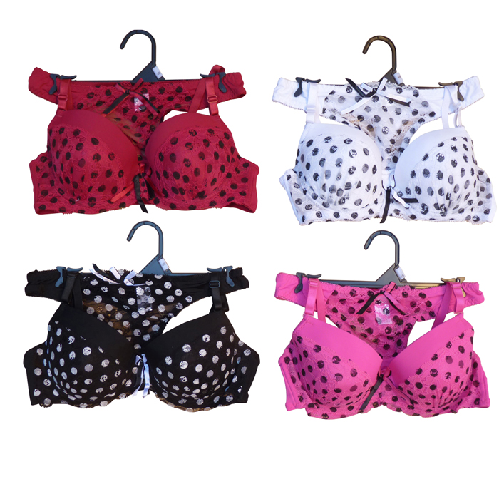 Ensemble soutien gorge avec tanga, Soutien gorge rembourré avec armatures. Bonnets recouvert d'une fine dentelle. Motif "pois noirs". Fronce sous bonnets. Nœuds bicolores entre bonnets. Bretelles réglables et amovibles. Tanga avec rappel de la dentelle à l 'avant, uni à l'arrière. Reste 3 tailles :90x1-85x2-80x1