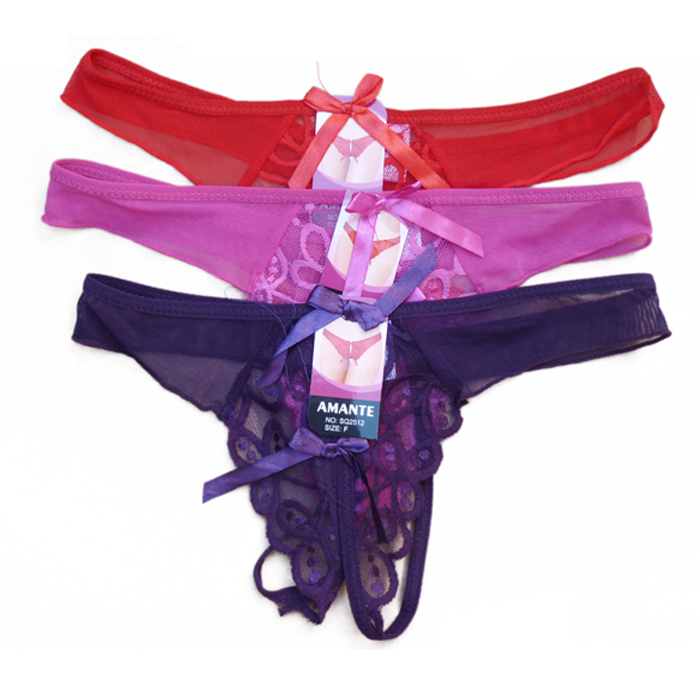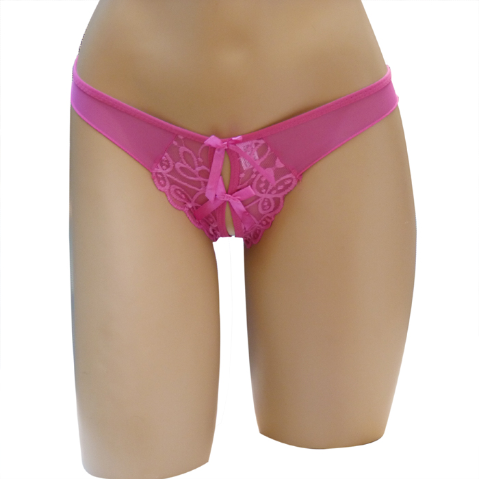 String ouvert, très sexy. Broderies "fleurs" sur voile stretch à l'avant. String fendu sur le devant et cerné par 2 nœuds papillons. Ouverture à l'arrière. Taille unique.