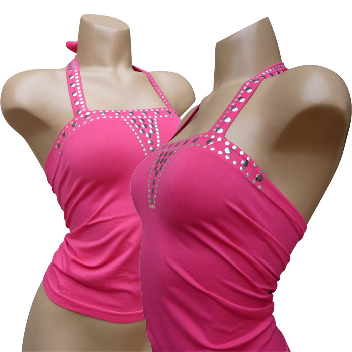 Top uni extensible sans couture, avec bande argentée de "clous" en surimpression sur le tissu sur le haut en formant un triangle entre bonnet. Larges brides avec "clous argentés" qui s'attachent autour du cou. Tissu extensible. Taille unique L