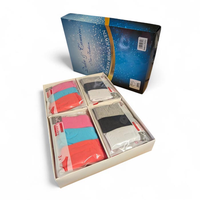 Slip femme coton majoritaire. Slip uni. Élastique à la taille. Présentation par lot de 3 dans des sachets plastiques avec crochets. 4 Tailles S-M-L-XL.